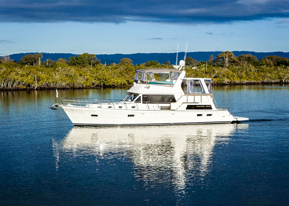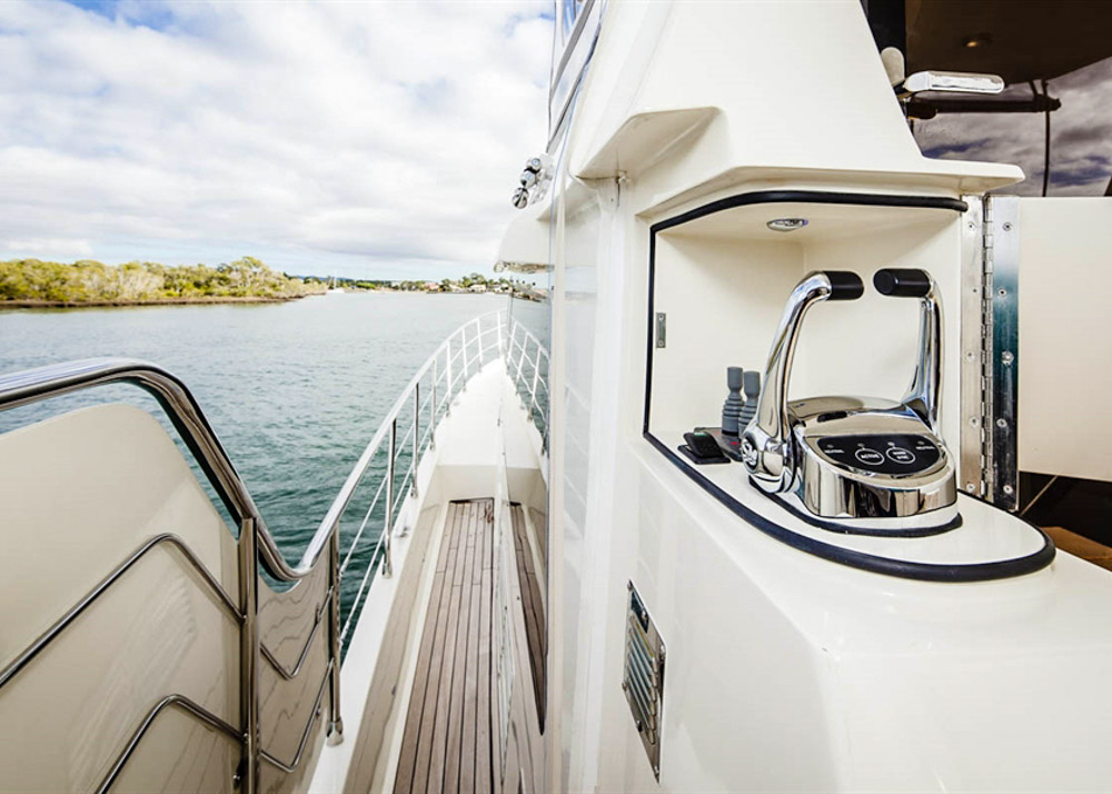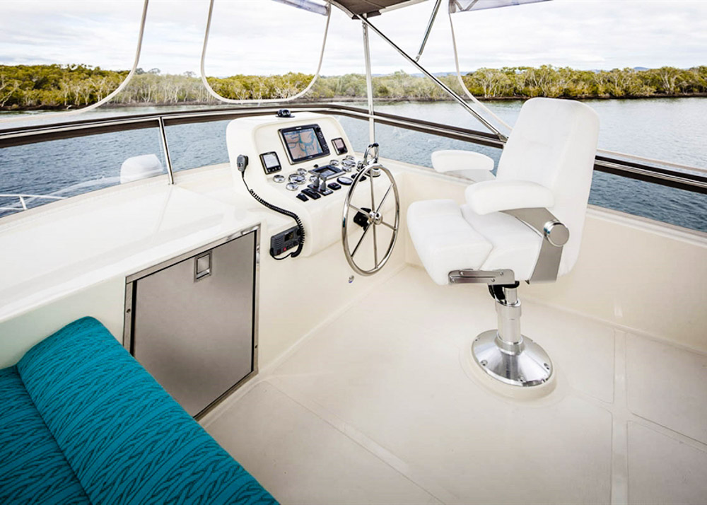 alaska49尾部的釣魚甲板不是個擺設,不銹鋼的冷藏冰柜,尾部第三站控制,冷熱水的水龍頭,甲板沖洗,還可以通過位于尾甲板的水密門進入主人艙。后甲板尾部的梯子通往上部寬大的飛橋,寬大的飛橋玻璃鋼硬頂恰好為后甲板遮陰蔽日,l型長沙發,寬大的餐桌和一個可麗耐的臺面的吧臺區為下午茶提供了良好的去處。
