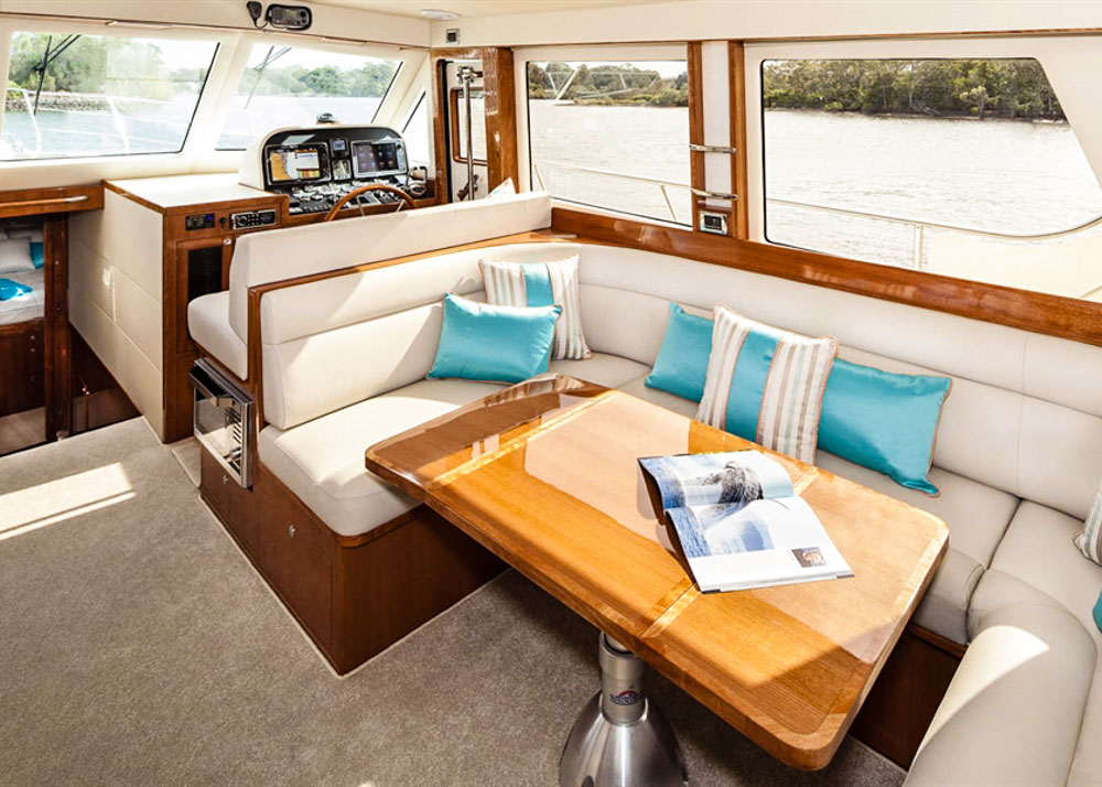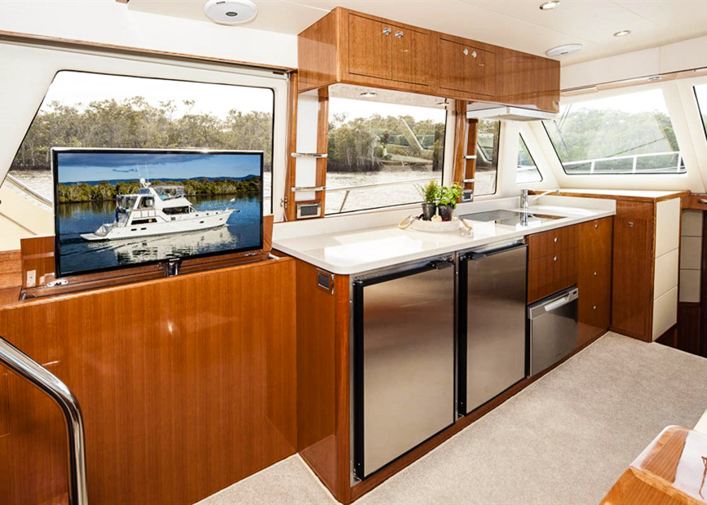 alaska阿拉斯加游艇沙龍的后門,基本是全通透型,實現了后甲板和沙龍大空間無縫對接。位于沙龍區的廚房設備有:美國的冰箱,德國的四眼電磁爐,烤箱可供船東烹制幾種不同風味的美食,溫馨舒適沙發和沙發讓船東和朋友盡享海上悠閑時光。