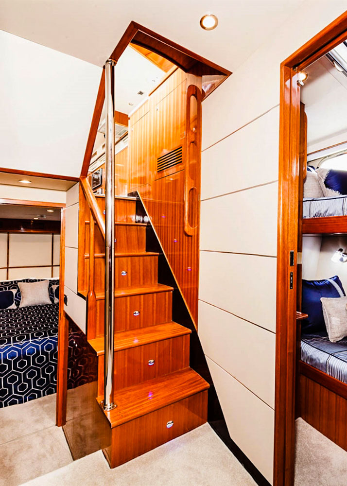 The open-plan integration of the helm, galley and dining and saloon areas allow for complete interaction with with everyone on board. The Alaska 59 features four cabins including a full beam King-sized master stateroom.
